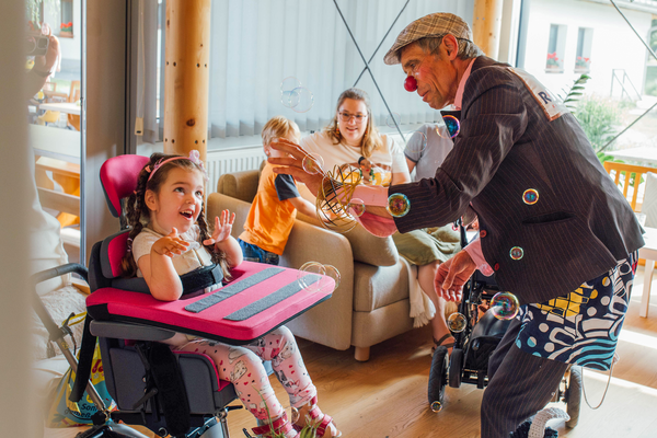 Clownin Elvira und Clown Franz schenken den Kindern Staunen im Kinderhospiz Sterntalerhof.