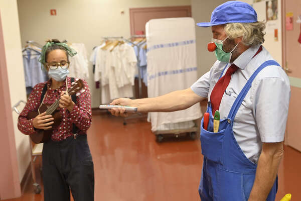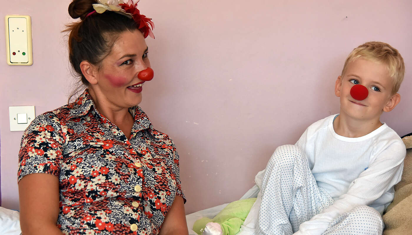 »Rdeči noski smo prišli,« sva bolnišnični klovnesi rekli vratarju. Zapisal si je najini imeni in nama dal obeska za obiskovalce.