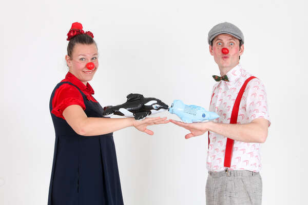 »Rdeči noski smo prišli,« sva bolnišnični klovnesi rekli vratarju. Zapisal si je najini imeni in nama dal obeska za obiskovalce.